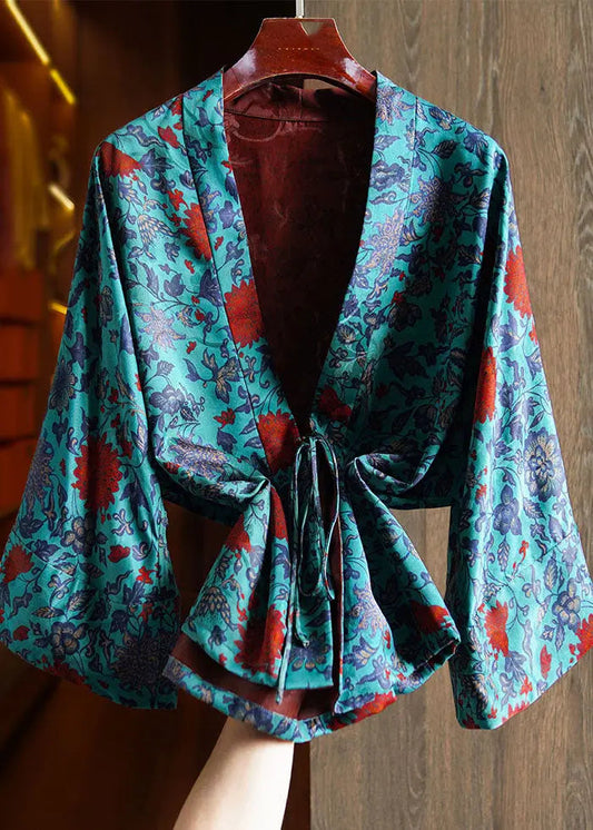 Manteau en soie bleu élégant à col en V et imprimé à la taille avec ceinture et manches longues ML1419