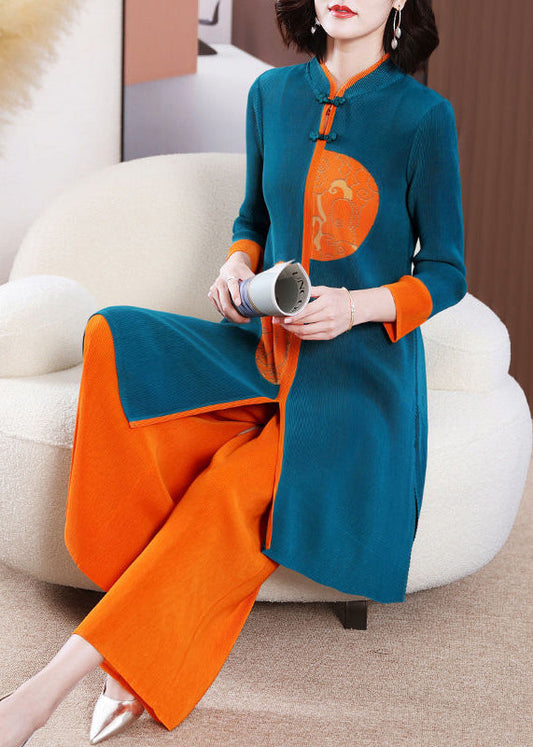 Ensemble deux pièces élégant en soie froissée à boutons chinois et col montant bleu printemps LY2727