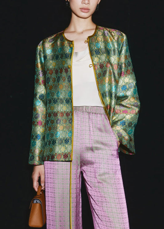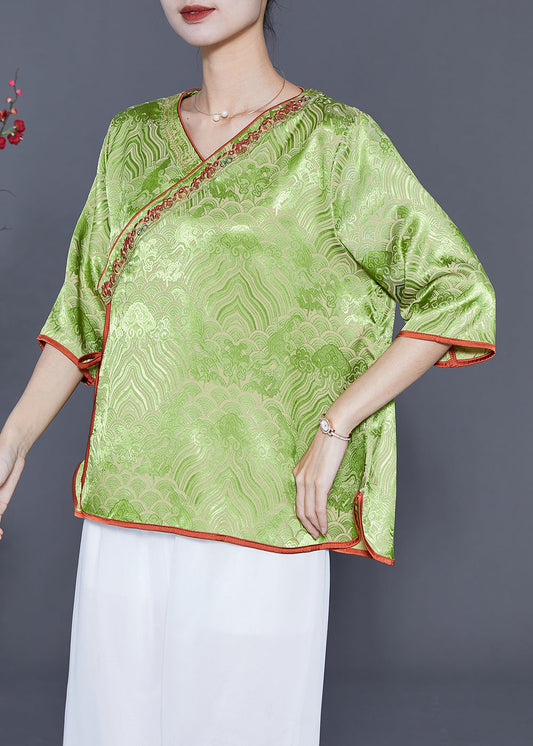 Chemise élégante en soie patchwork à boutons jacquard chinois vert avec manches bracelet LY8284