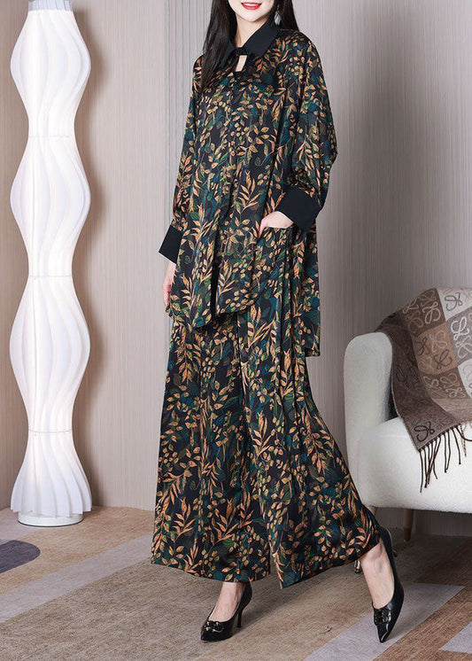 Ensemble deux pièces en soie drapée surdimensionnée à imprimé feuilles vertes élégant Printemps LY3752