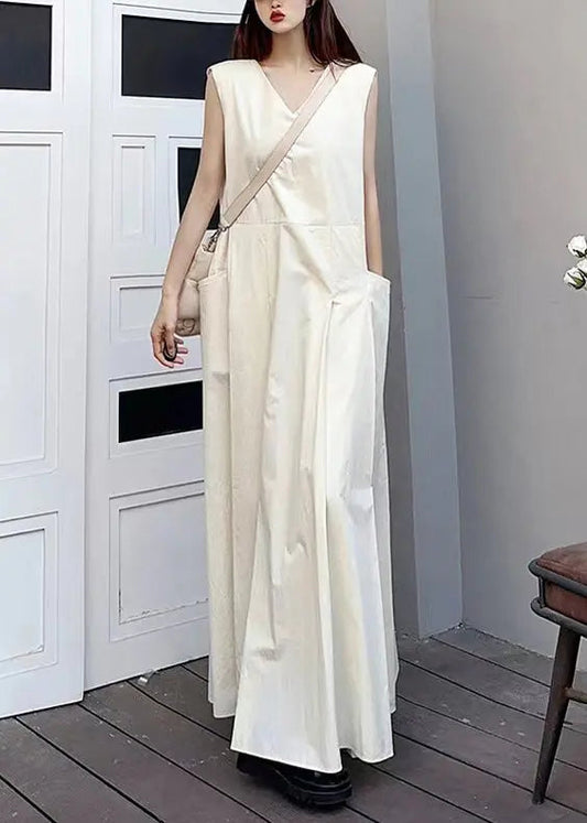 Robe longue en coton patchwork blanche élégante à col en V et poches sans manches LY9060