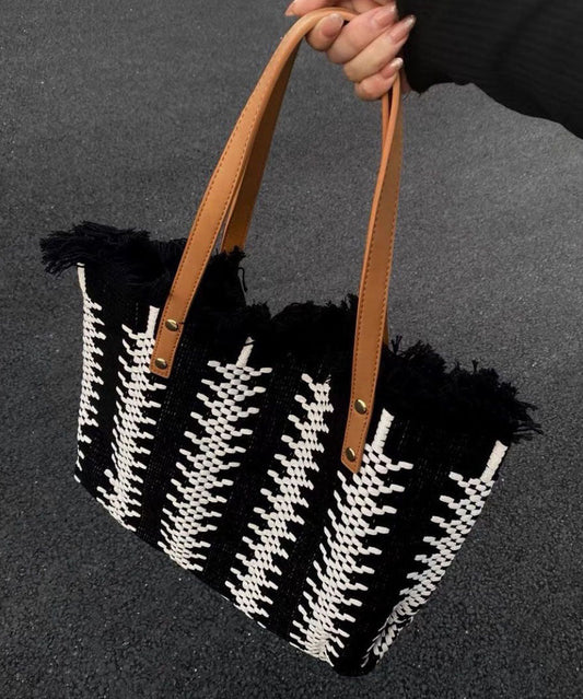 Sac à main élégant en coton à rayures colorées noires et à grande capacité LY1763