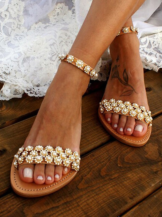 Beaded Sandals Boho Floral Ankle Chic with Straps Flat for