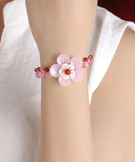 Magnifique bracelet à breloques en coquillage émaillé de couleur rose clair avec fleur œil de chat et grenat ML0657