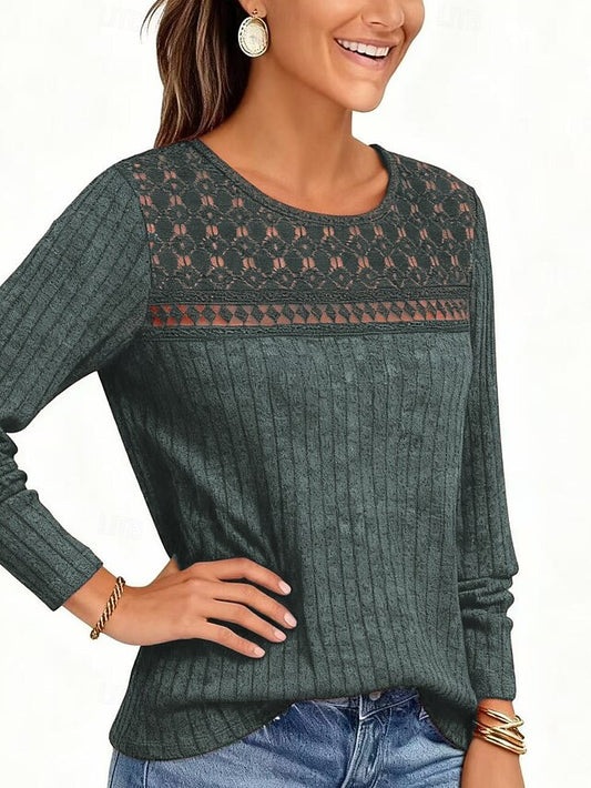 Women's Ribbed Knit Tops T Shirt Eyelet Vintage Casual Long