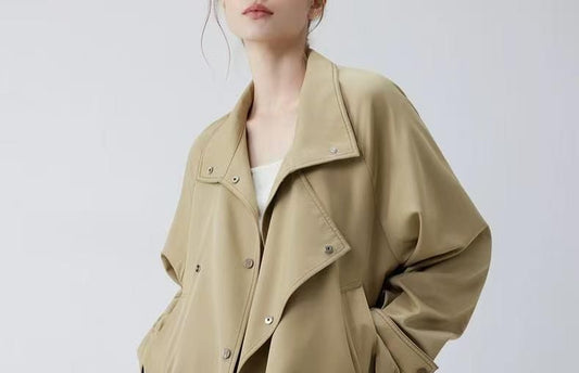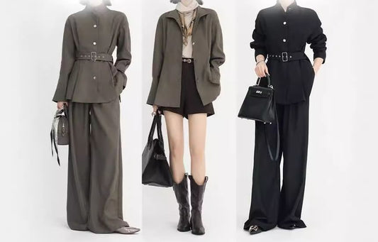 Stand Collar Plain Button Trench Jacket / High Rise Wide Leg Pants