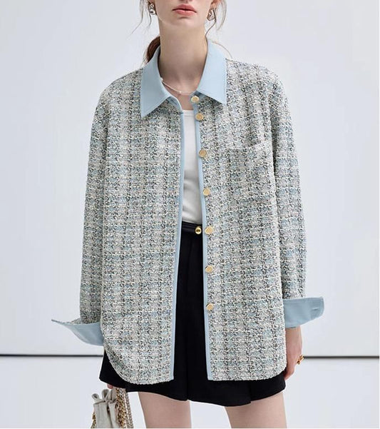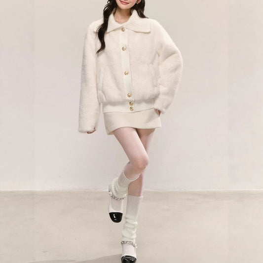 Set: Collared Ribbon Accent Button-Up Jacket + Mini Skirt