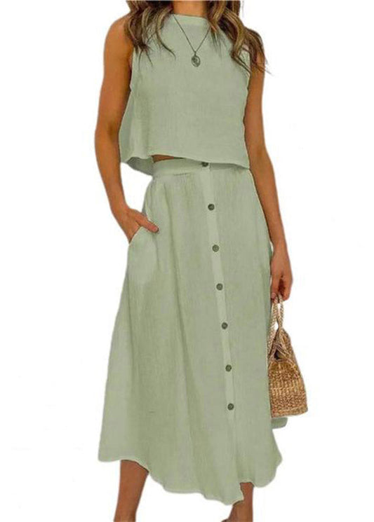 Ensemble deux pièces haut uni bleu à col rond et jupe longue pour l'été LY3878