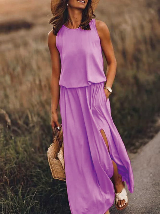 Robe longue tissée sans manches à col rond et à imprimé uni QPQ93