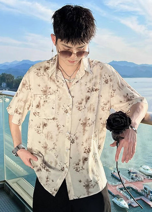 Chemises hawaïennes pour hommes à imprimé col Peter Pan et café pour l'été HG018
