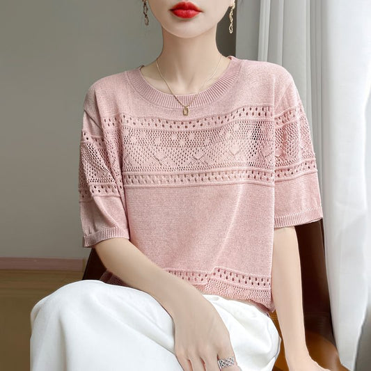 Short-Sleeve Crew Neck Plain Pointelle Knit Top