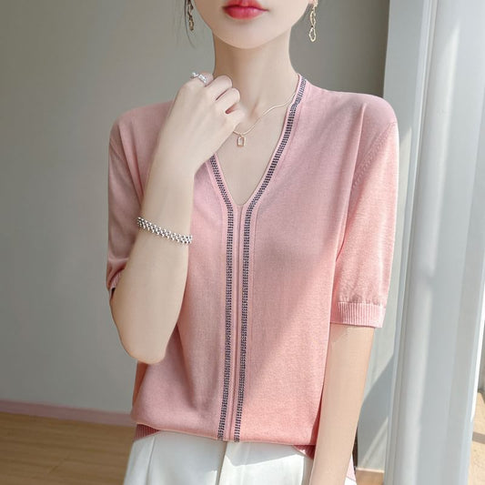 Elbow-Sleeve V-Neck Rhinestone Knit Top
