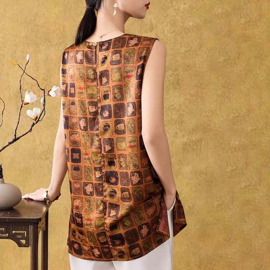 3/4-Sleeve Stand Collar Jacquard Frog Buttoned Satin Blouse