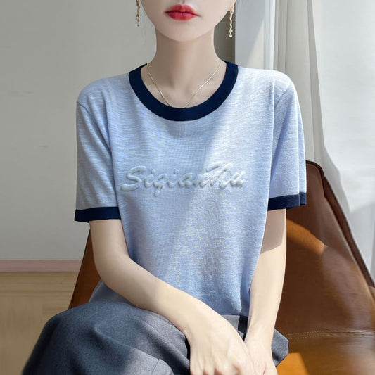 Short-Sleeve Round Neck Lettering Contrast Trim Knit Top