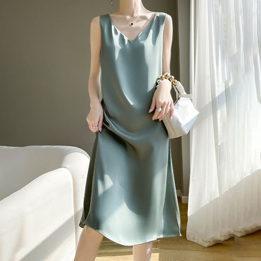Sleeveless V-Neck Plain Satin Midi Shift Dress