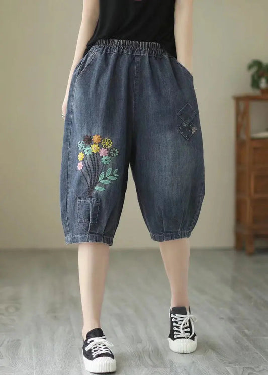 Pantalon sarouel en denim bleu marine brodé à fleurs pour l'été LY8635