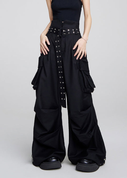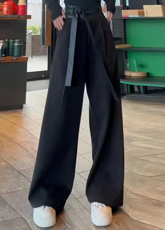 Pantalon en coton patchwork taille haute à lacets noir français Automne LY9069
