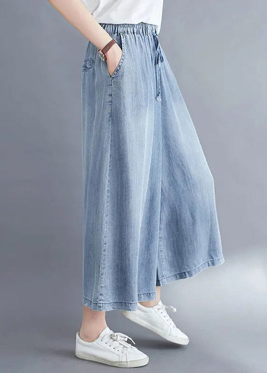 Pantalon large en denim drapé à taille élastique bleu clair pour femme, été LY8663