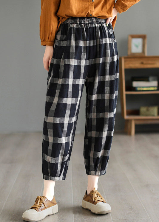 Pantalon court décontracté en lin à taille haute à carreaux noirs LY4581