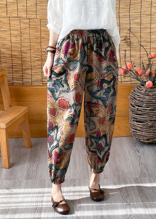 Pantalon court en lin uni avec poches kaki bohème et taille élastique pour l'été LY4496