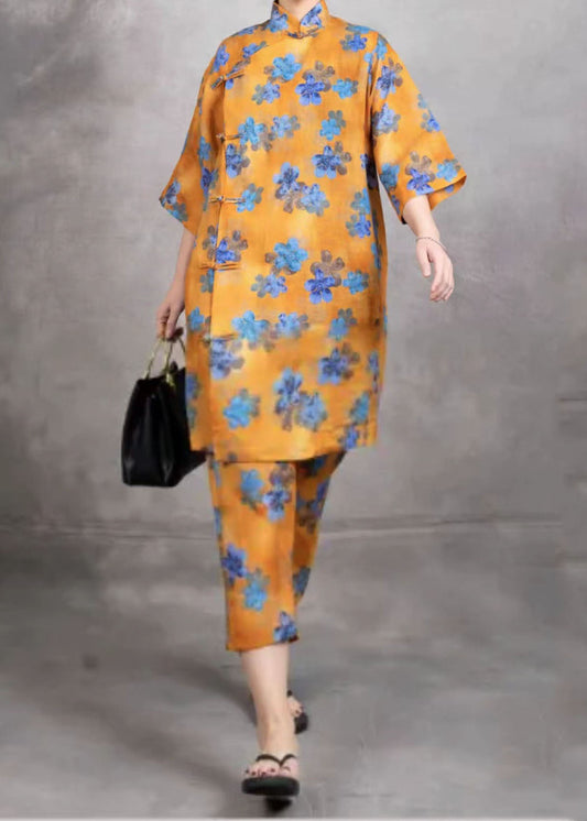 Ensemble deux pièces en lin avec haut et pantalon imprimé noir de style chinois pour l'été LY4577