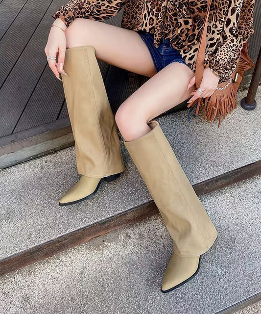 Bottes hautes à talons épais et coutures chics en tricot gris QK067