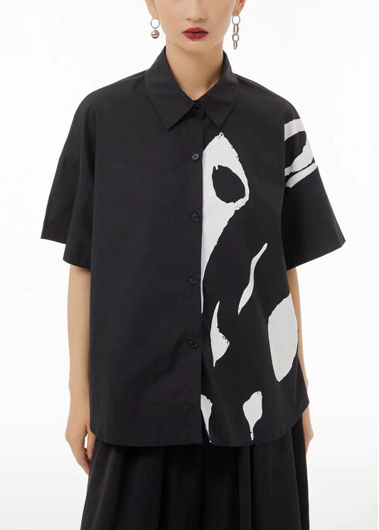Chemise en coton froissé asymétrique noire Art Patchwork Tops d'été LC0112
