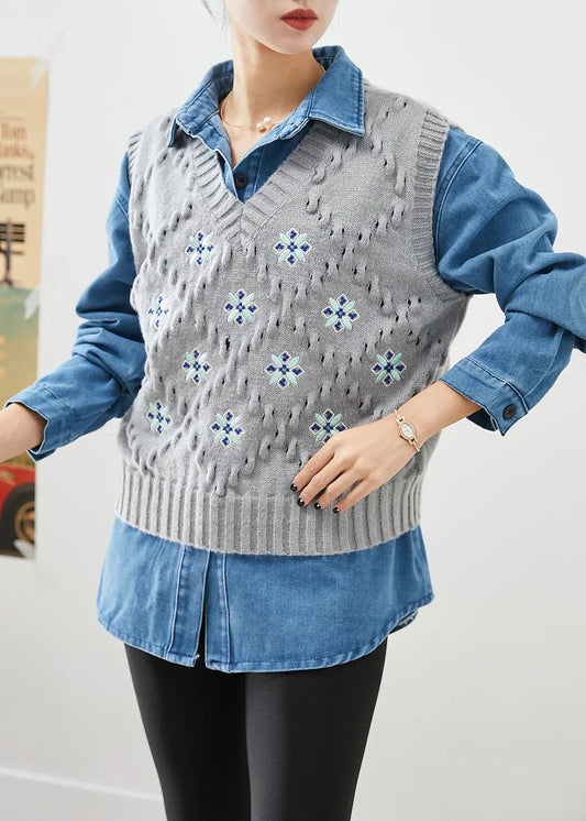 Ensemble deux pièces tendance avec gilet en tricot épais surdimensionné et chemise en jean pour l'automne ML0514