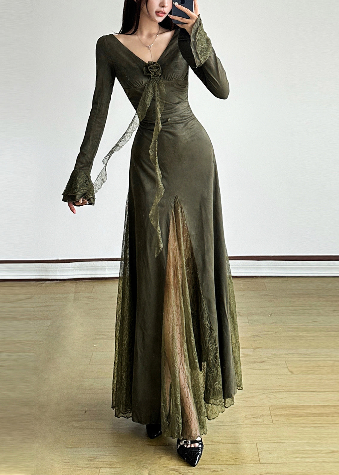 Laissez-vous séduire par l'élégance de notre élégante robe longue en dentelle patchwork vert noir, ornée de détails en dentelle envoûtants et de manches évasées flatteuses. Cette robe dégage une touche de sophistication et d'exclusivité, ce qui en fait le complément idéal de votre garde-robe.
