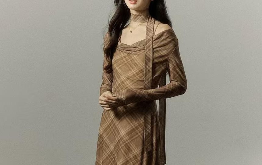 Long-Sleeve Cowl Neck Plaid Mesh Midi A-Line Dress