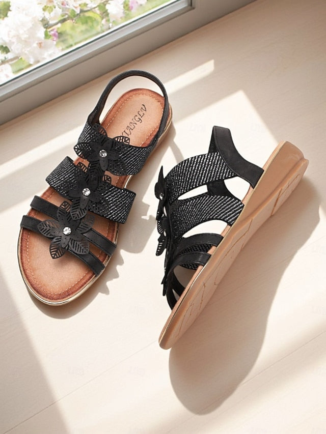 Women's Beige Floral Rhinestone Flat Sandals – Elegant
