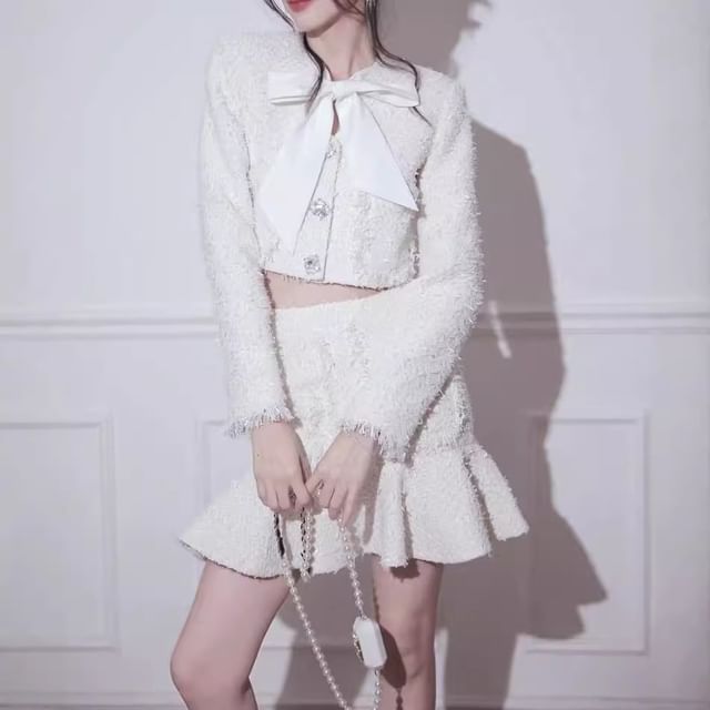 Set: Plain Bow Cropped Single-Breasted Jacket + High Rise Mini Mermaid Skirt