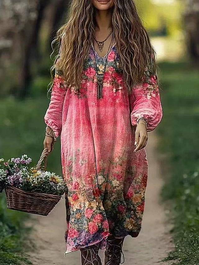 Dresses Type: Boho Dress, Casual Dress, Swing Dress, Fabric: Polyester, Gender: Women's, Design: Print, Occasion: Daily, Vacation, Style: Casual, Vintage, Print Type: Print, Fit Type: Regular Fit, Dress Length Type: Midi Dress, Neckline: V Neck, Sleeve Length: Long Sleeve, Elasticity: Micro-elastic, Look After Me: Hand wash, Dry clean only, Machine wash, Pattern: Floral, Season: Fall, Summer, Spring,
