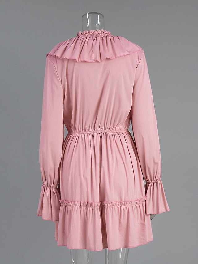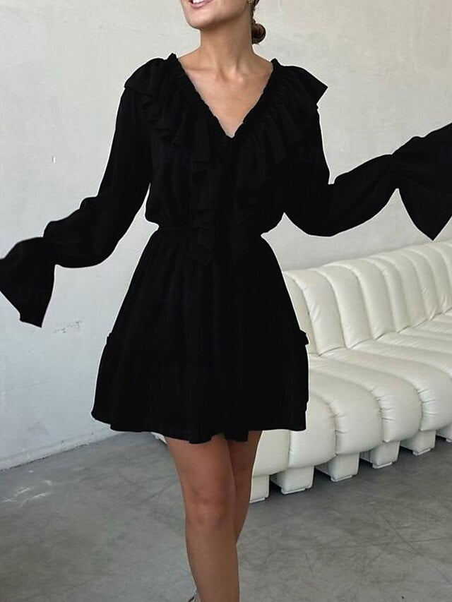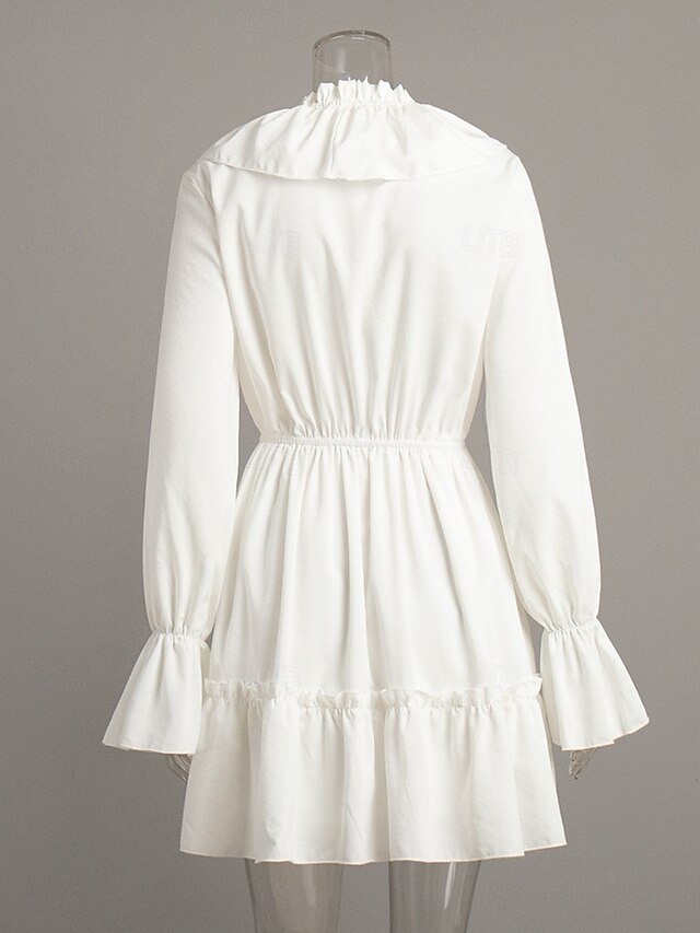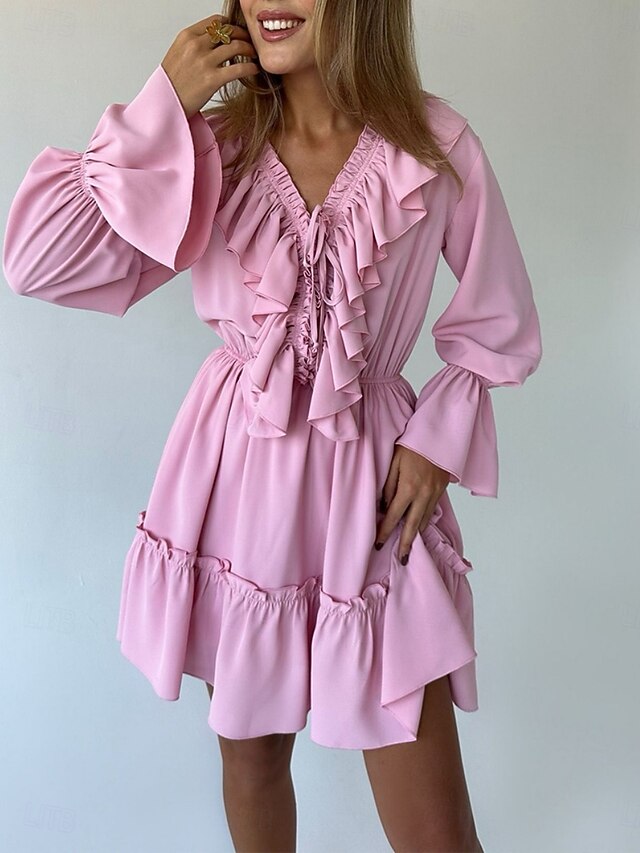 Dresses Type: Casual Dress, Chiffon Dress, Fabric: Chiffon, Gender: Women's, Design: Patchwork, Occasion: Weekend, Vacation, Going out, Outdoor, Style: Fashion, Modern, Elegant, Fit Type: Regular Fit, Dress Length Type: Mini Dress, Neckline: V Neck, Sleeve Length: Long Sleeve, Sleeve Type: Flare Cuff Sleeve, Elasticity: Inelastic, Look After Me: Hand wash, Machine wash, Pattern: Plain, Season: Summer, Spring,