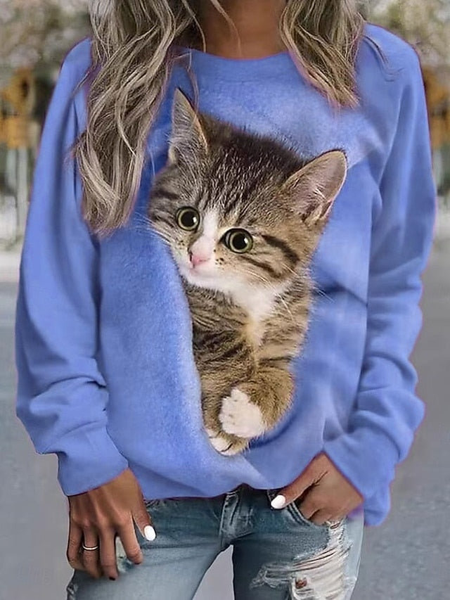 Gender: Women's, Style: Casual, Occasion: Casual, Holiday, Street, Tops Type: Pullover Sweatshirt, Neckline: Crew Neck, Fabric: Polyester, Design: Print, Sleeve Length: Long Sleeve, Elasticity: Micro-elastic, Look After Me: Machine wash, Top Length: Regular Tops, Pattern: Cat, Animal, Graphic, Season: Spring, Winter, Fall, Fit Type: Regular Fit, Category: Sweatshirt,