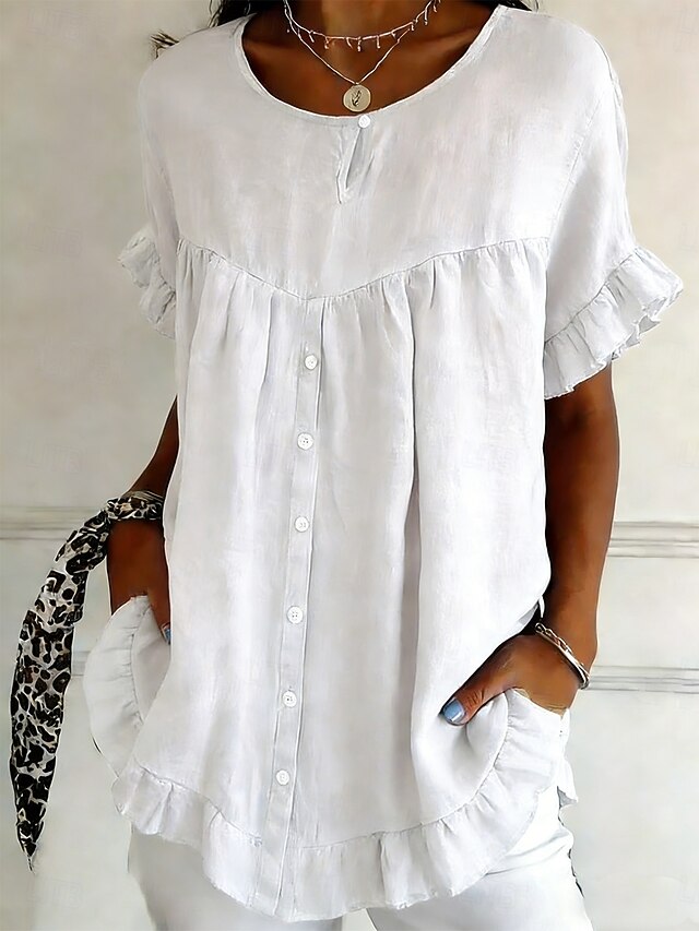 Fabric: Cotton Linen, Tops Type: Ruffle Shirt, Cotton Linen Shirts, Shirt, Blouse, Gender: Women's, Design: Ruffle, Occasion: Going out, Daily, Holiday, Style: Modern, Casual, Stylish, Classic, Category: Shirt, Fit Type: Regular Fit, Neckline: Crew Neck, Sleeve Length: Short Sleeve, Elasticity: Inelastic, Look After Me: Washable, Hand wash, Machine wash, Top Length: Regular Tops, Pattern: Plain, Season: Spring, Summer,