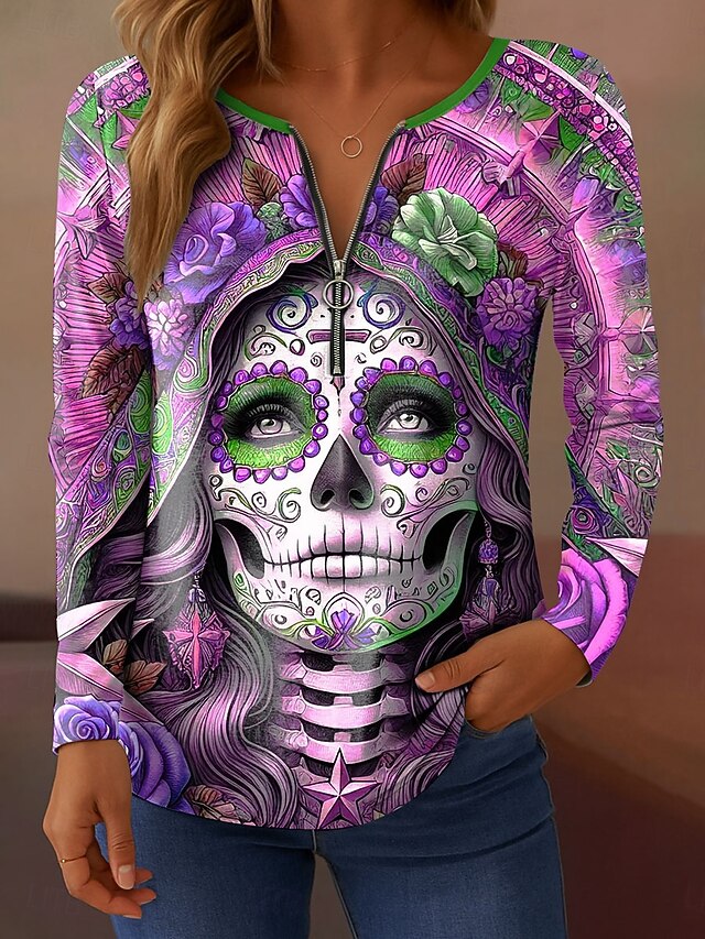 Fabric: Polyester, Gender: Women's, Tops Type: T Shirt, Design: Print, Zipper, Occasion: Daily, Weekend, Style: Stylish, Vintage, Casual, Category: T-Shirt, Fit Type: Regular Fit, Festival: Halloween, Neckline: Round Neck, Sleeve Length: Long Sleeve, Elasticity: Micro-elastic, Look After Me: Washable, Hand wash, Machine wash, Top Length: Regular Tops, Pattern: Graphic, Skull, Season: Winter, Fall,