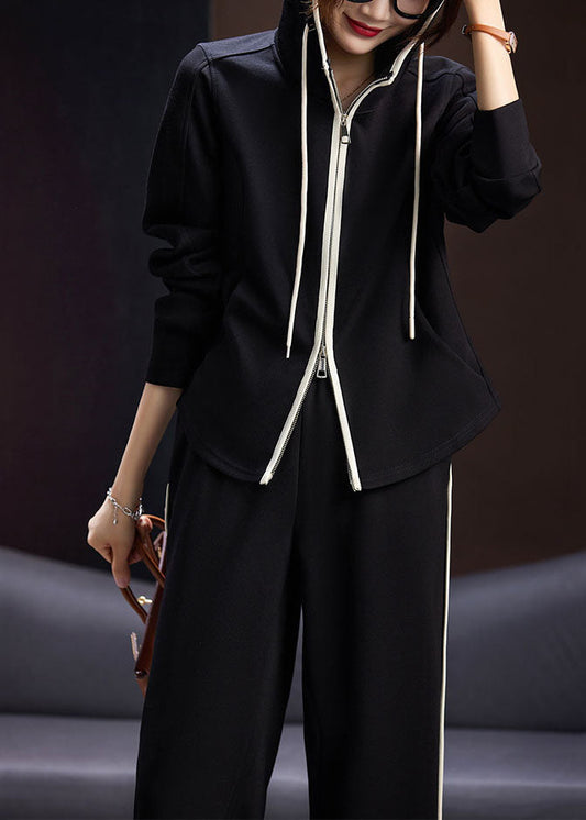 Plus Size Black Drawstring Zippered Hooded Coat Fall ML2034