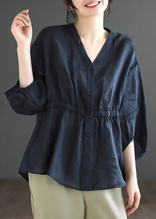 Navy Wrinkled Patchwork Linen Shirt V Neck Bracelet Sleeve ML2371