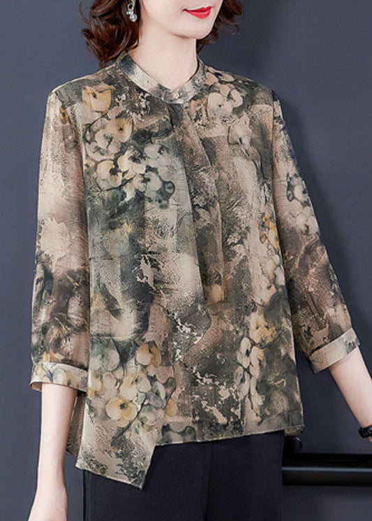 Unique Green Stand Collar Print Silk Shirt Tops Spring LY0472