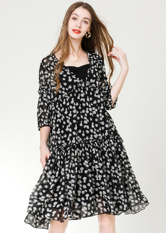Casual Black Ruffled Print Chiffon Beach Dresses Bracelet Sleeve LY0337
