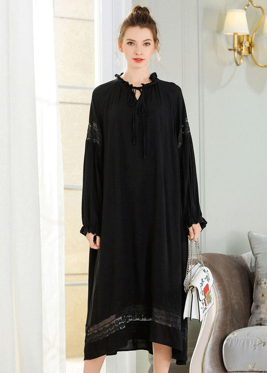 Modern Black High Neck Ruffled Patchwork Bow Cotton Robe Dresses Spring LY0276