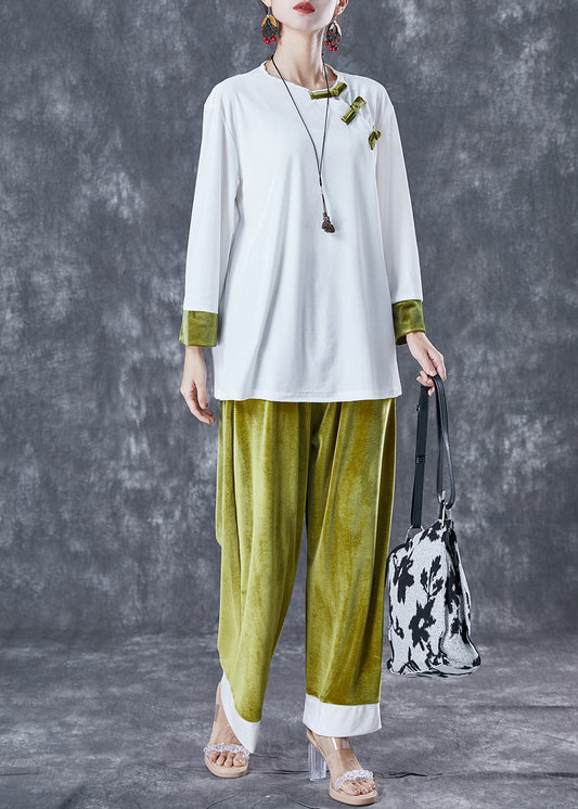 Bohemian White Green Chinese Style Patchwork Silk Velour Two Pieces Set Spring TA1041
