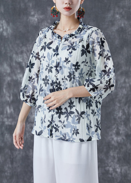 Chic White Ruffled Print Cotton Shirts Bracelet Sleeve TA1067