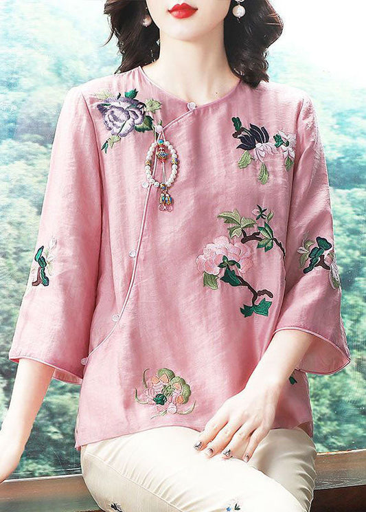 Chinese Style Pink Embroideried Patchwork Chiffon Tops Spring TP1052