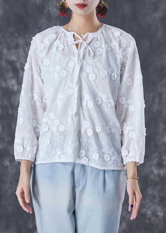 Elegant White Embroideried Floral Lace Up Cotton Tops Fall ML3058