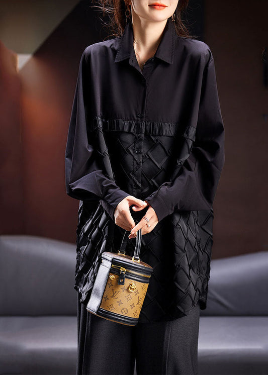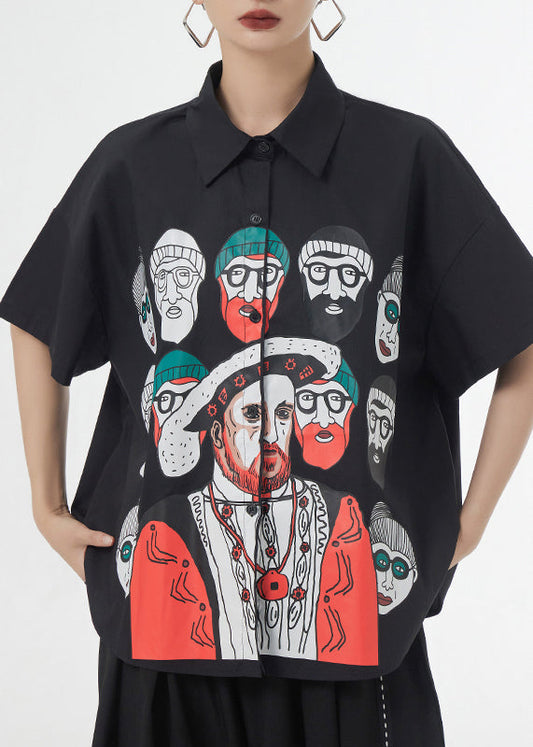 Italian Black Peter Pan Print Collar Patchwork Cotton Shirt Summer LY9500