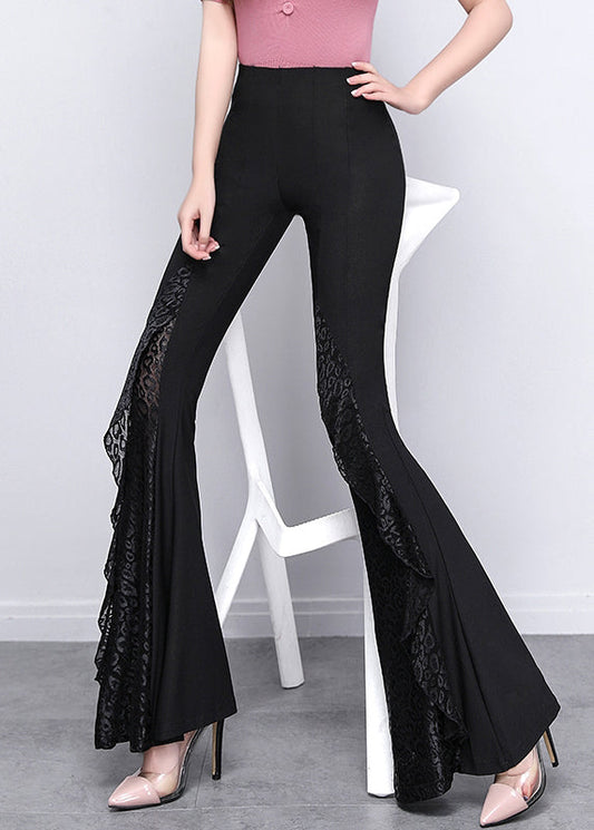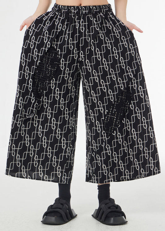 Italian Black Print Pockets Patchwork Silk Cotton Wide Leg Pants Summer LY9348