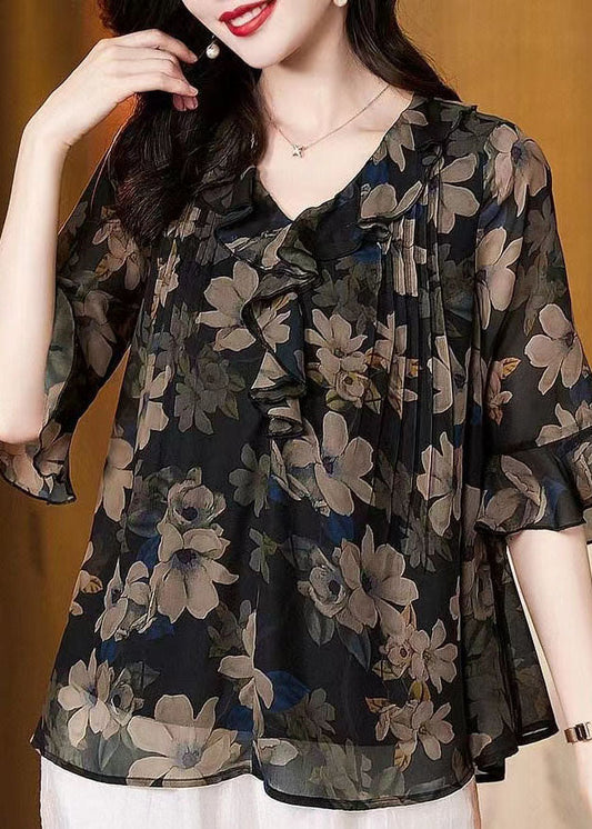 Italian Black Print Wrinkled Patchwork Silk Shirt Top Flare Sleeve LY6957