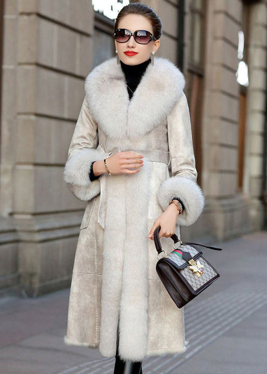 Boho Khaki Fox Collar Cinched Fuzzy Rabbit Leather And Fur Coats Winter LY9411